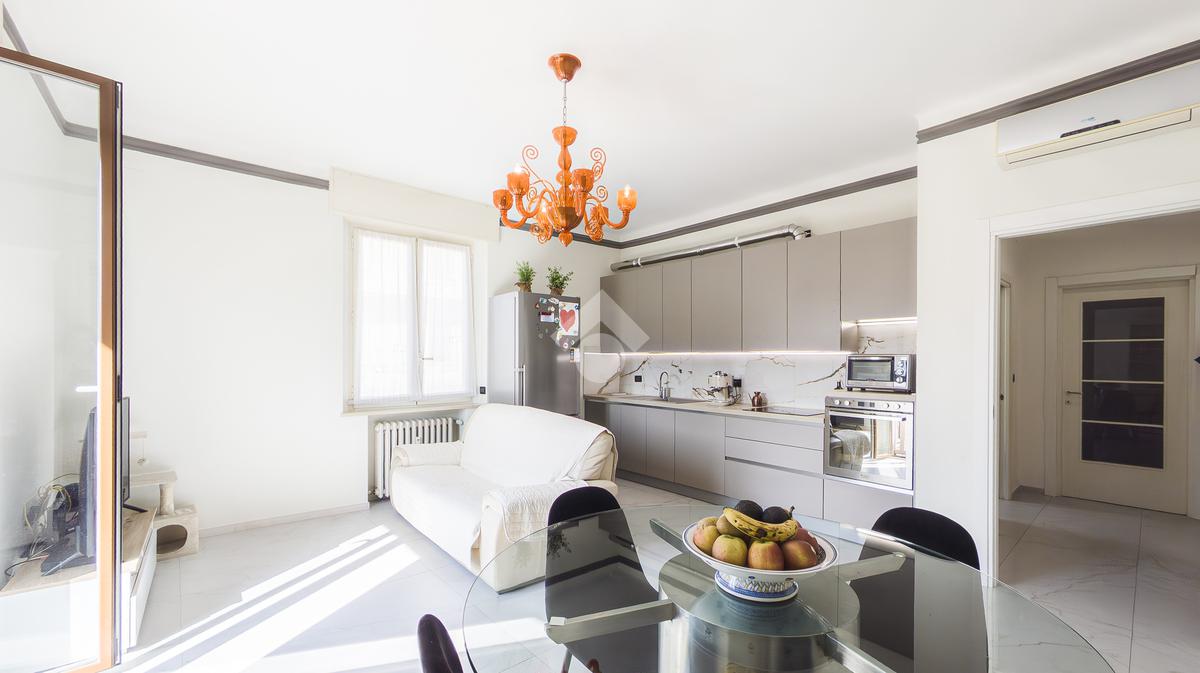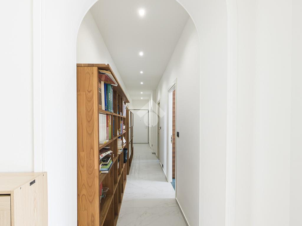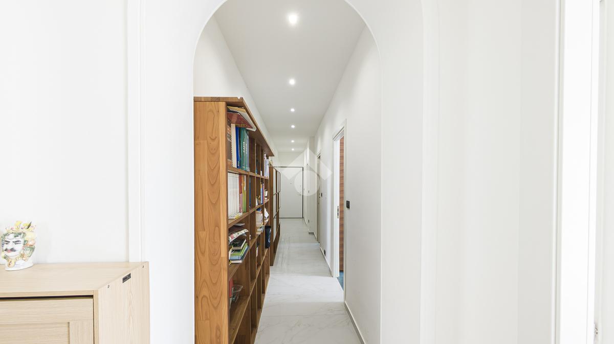 L'ingresso dell'appartamento conduce a un elegante corridoio che apre la vista sul cuore pulsante della casa, ovvero ad un ampio soggiorno con cucina a vista, uno spazio aperto, ideale per cucinare e godersi momenti di convivialità, da qui si ha accesso diretto al balcone.