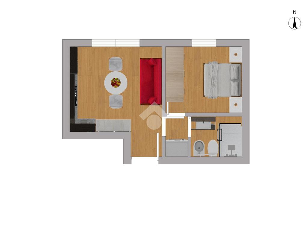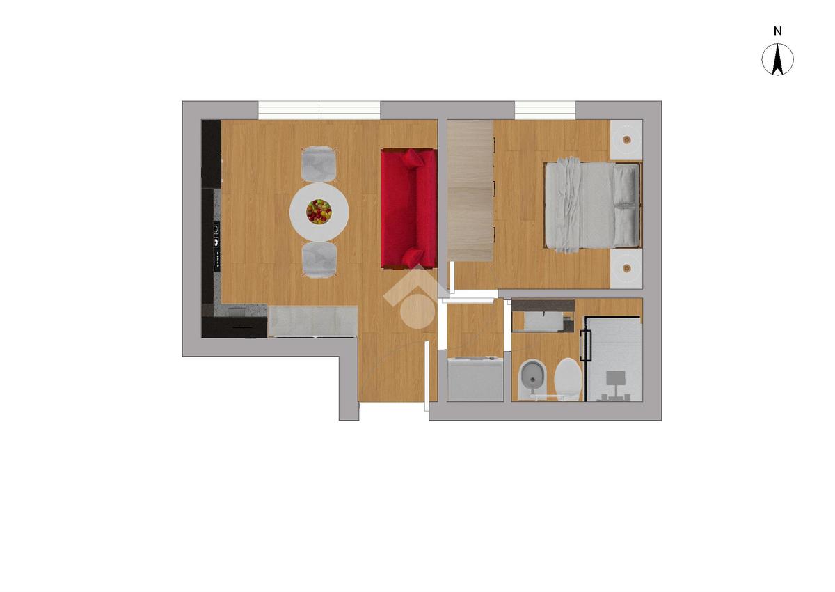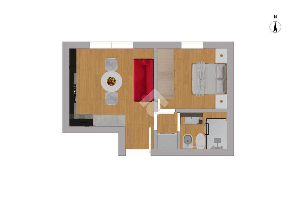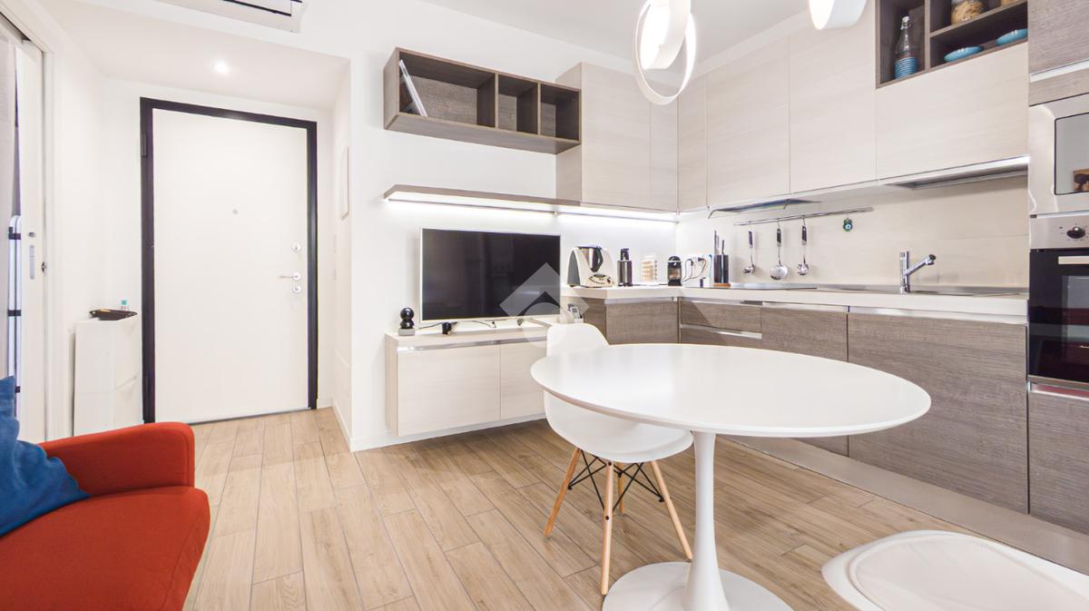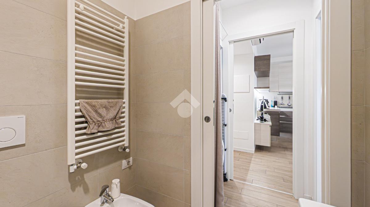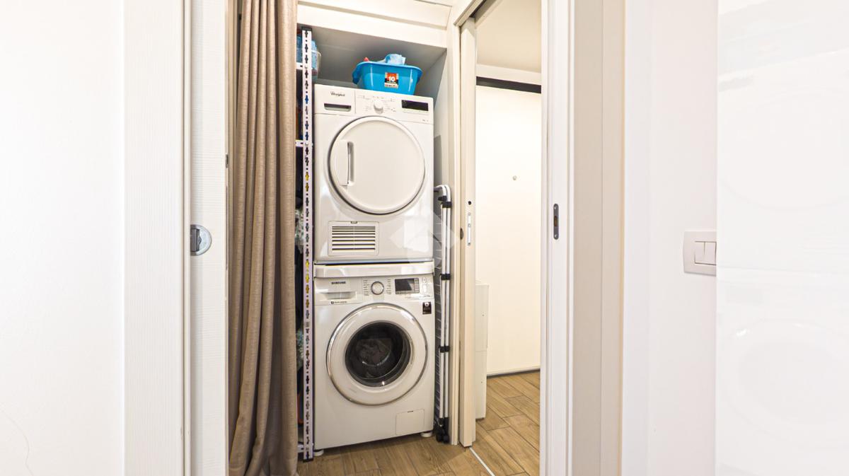 L’ingresso si apre su un luminoso soggiorno con cucina a vista, dove la cucina, realizzata su misura, è dotata di piano cottura a induzione e completa di tutti gli elettrodomestici, inclusa la lavastoviglie, integrata con eleganza nell’arredo. Proseguendo attraverso un comodo disimpegno, troviamo una pratica zona lavanderia, perfettamente organizzata, a seguire, la camera da letto, accogliente e silenziosa, e un bagno moderno dotato di box doccia.